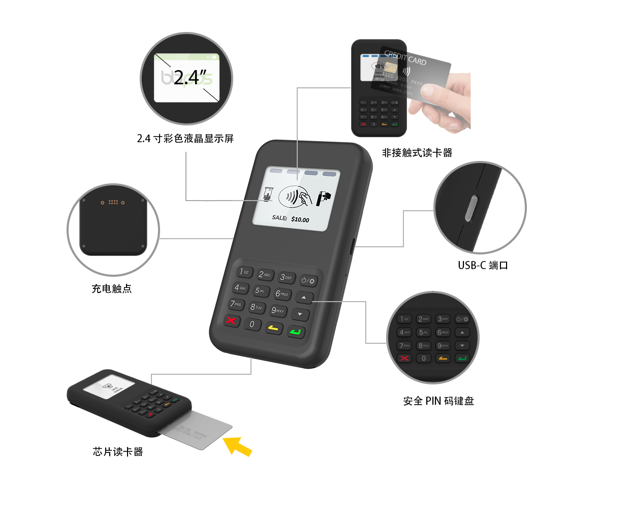 机身轻巧,支持芯片卡和非接触式支付,同时支持 PIN 输入。